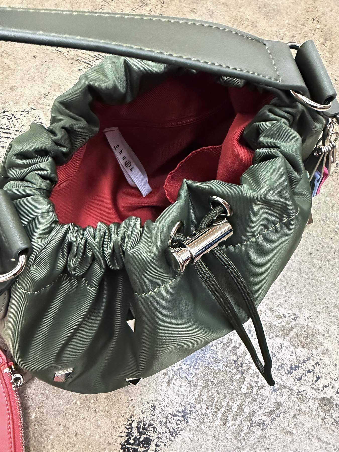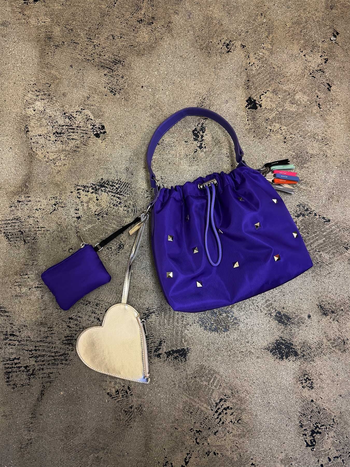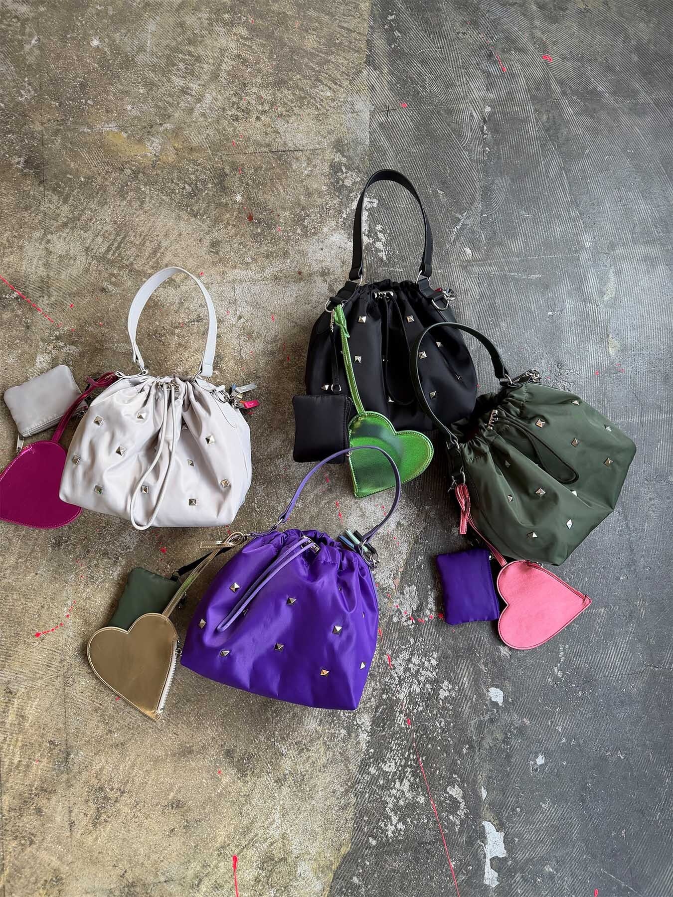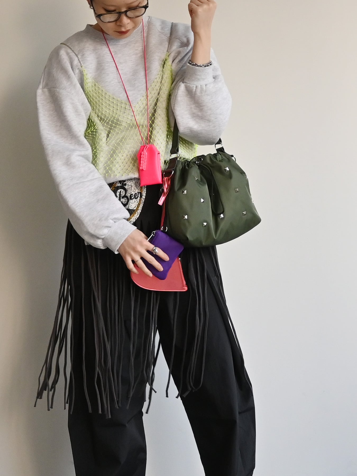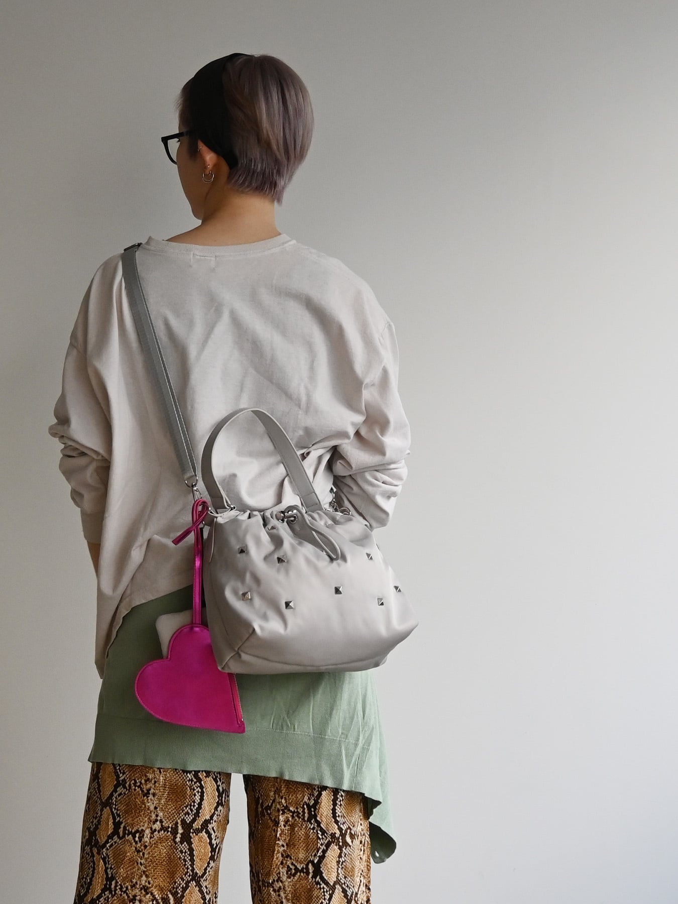 ふんわり中綿入りの本体には、スタッズを散りばめた巾着バッグ。