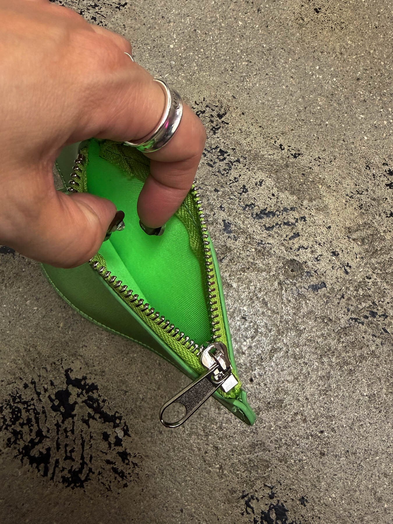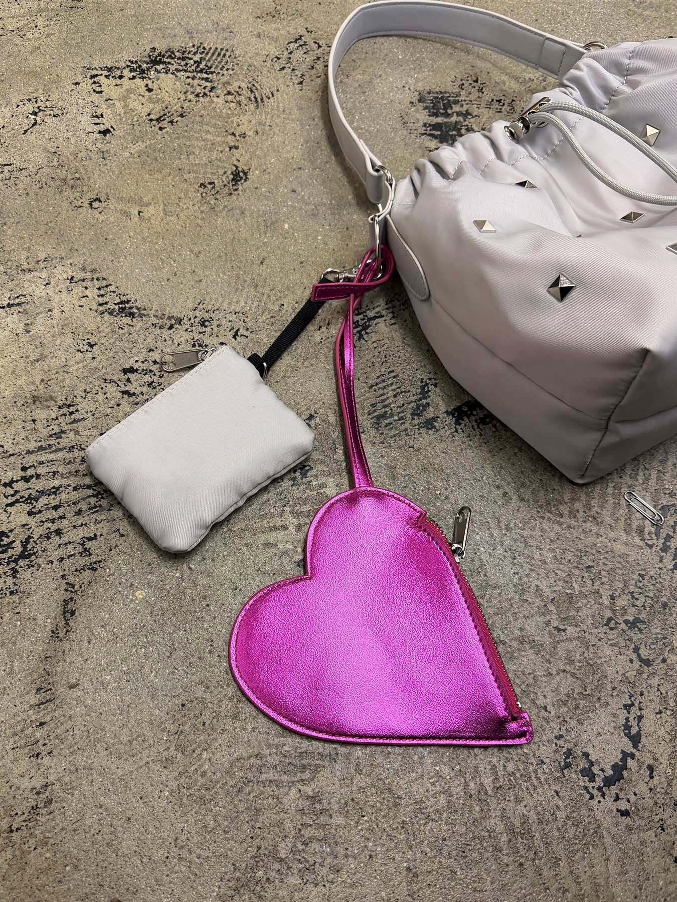 ストラップ部分にはハートモチーフポーチとミニポーチのチャームセット付き。