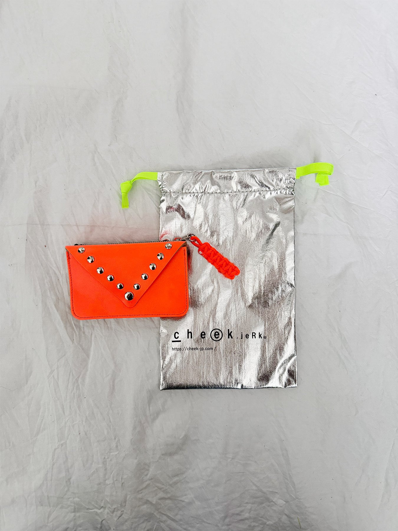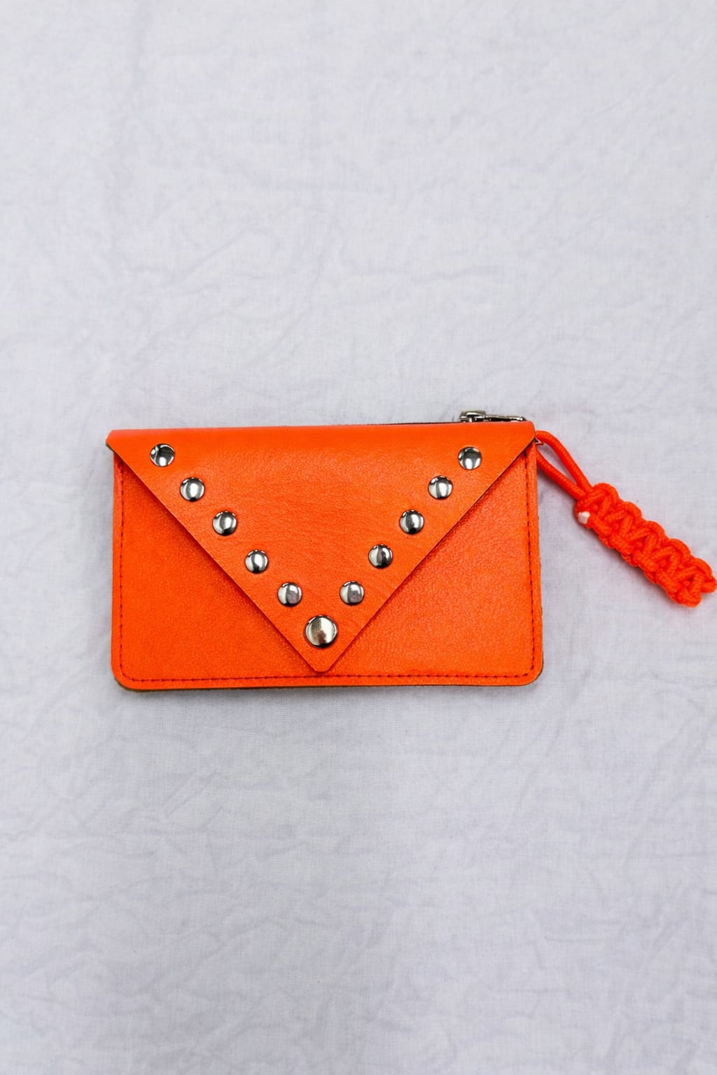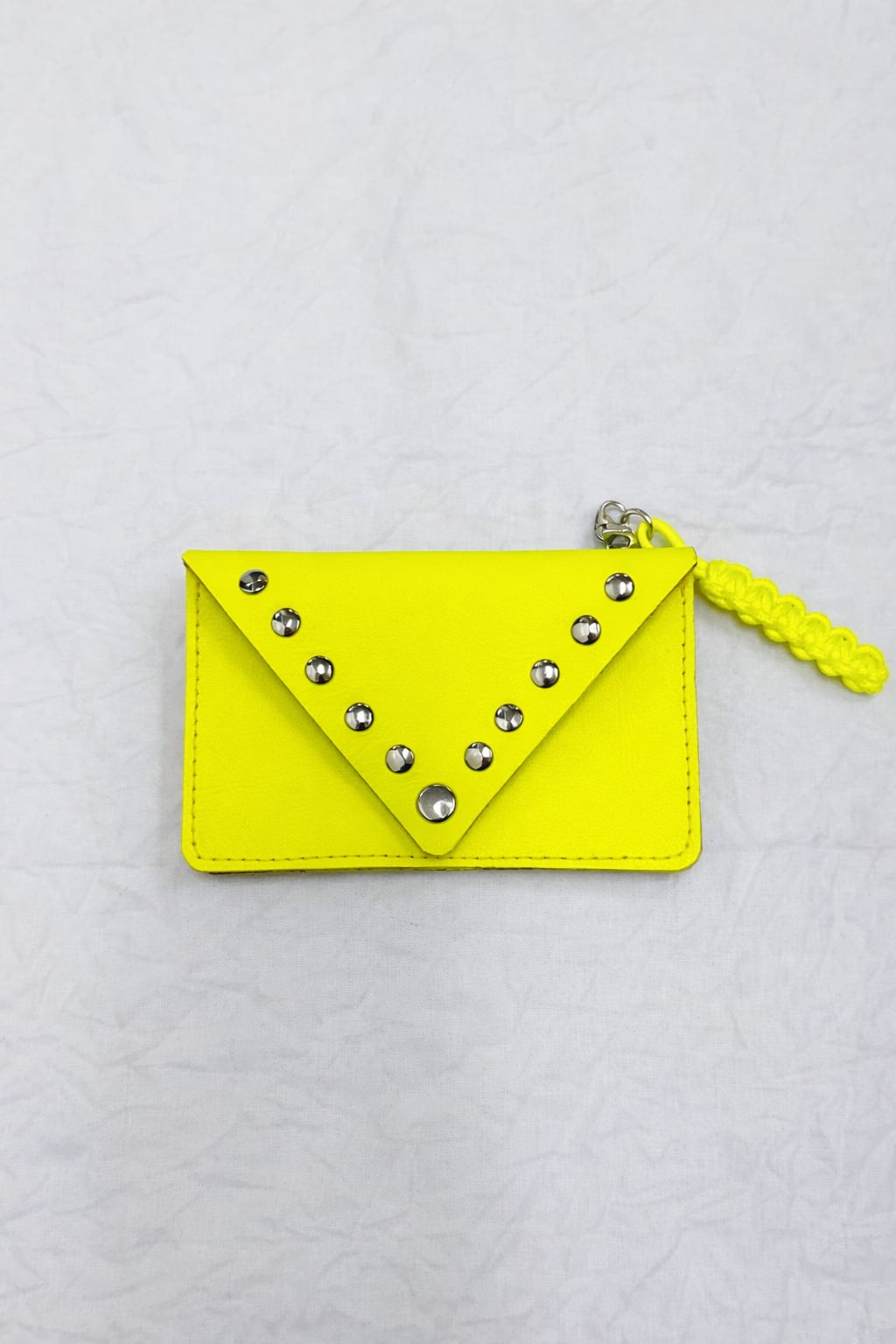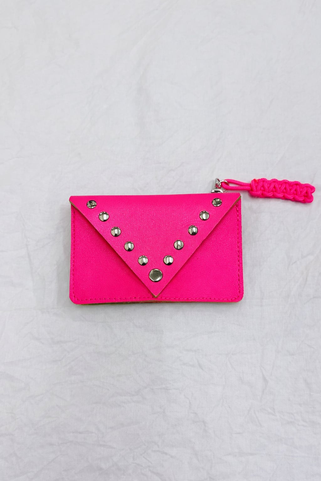 ネオンカラーとスタッズが目を惹くエンベロープ型ミニウォレット。