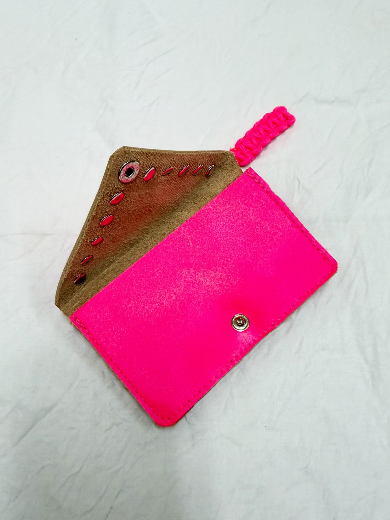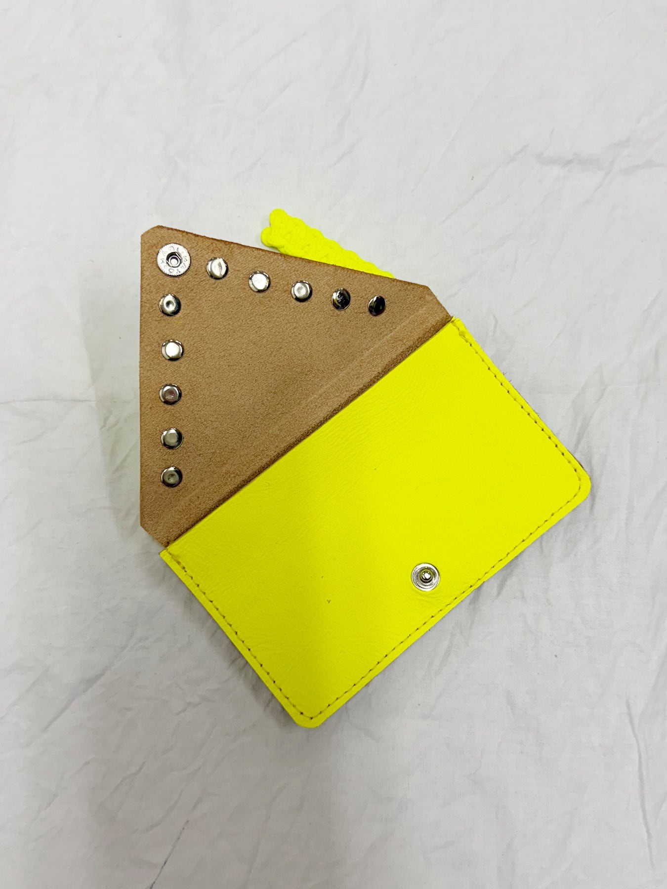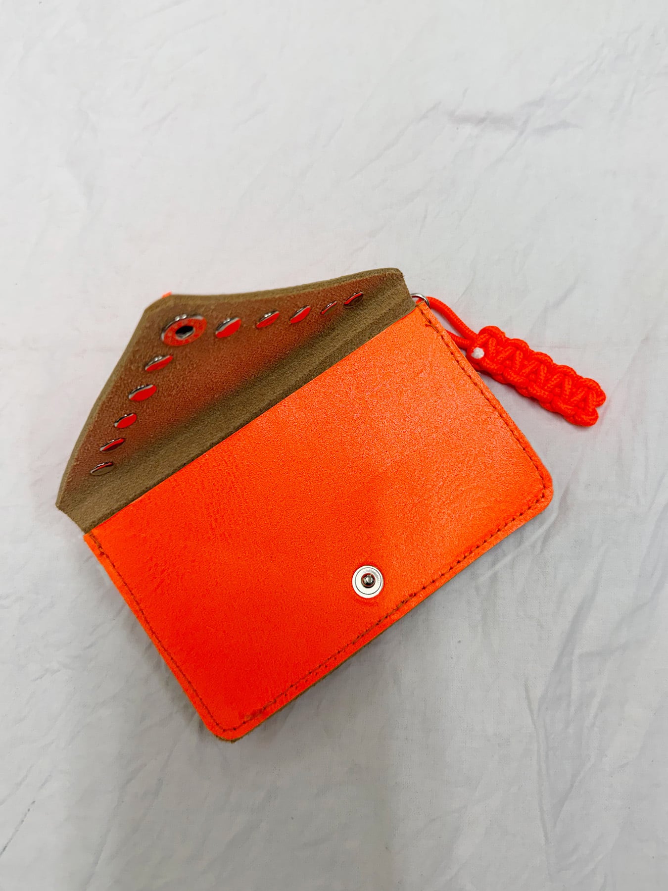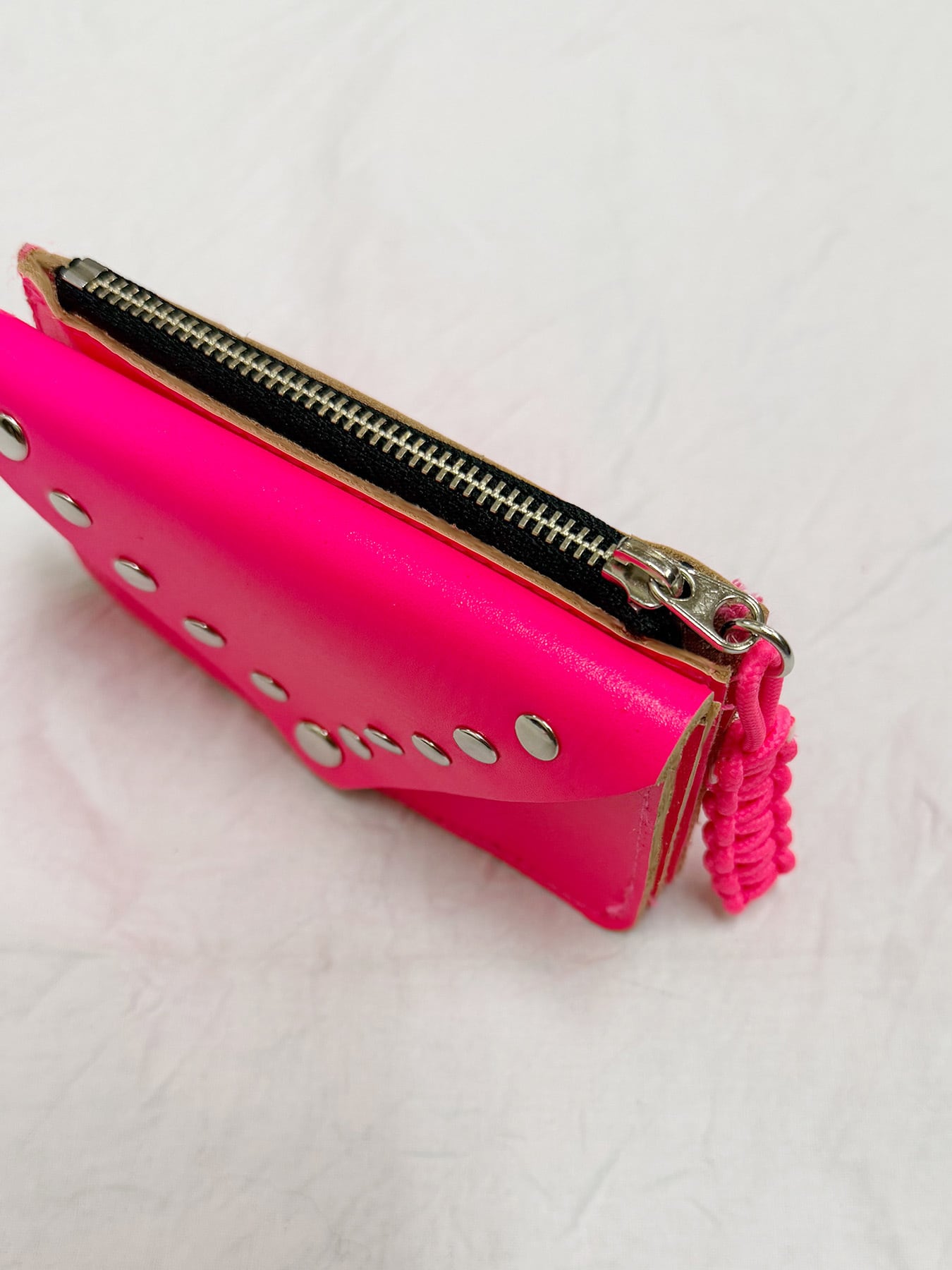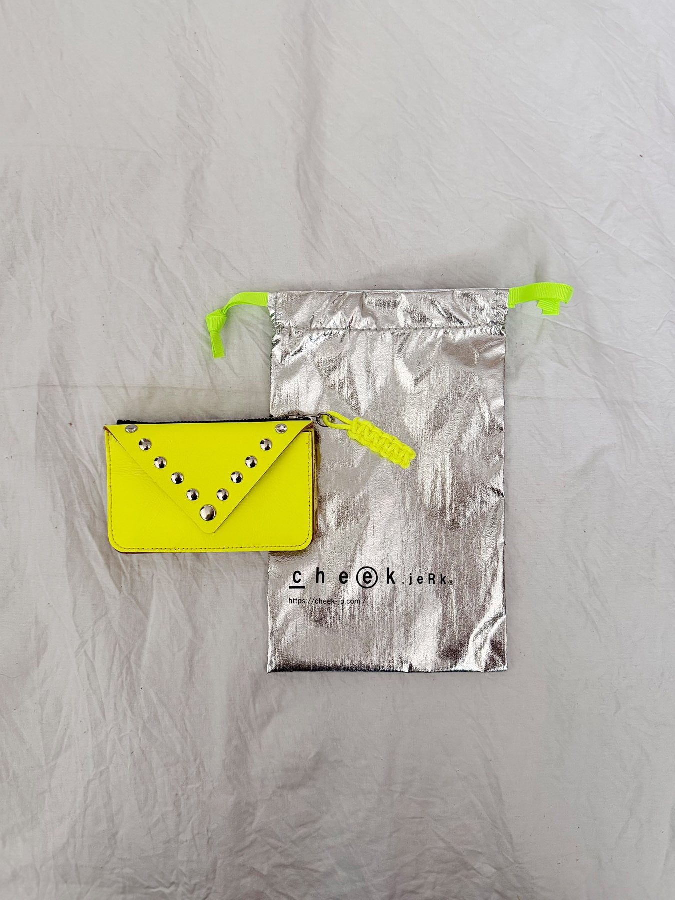 ネオンカラーとスタッズが目を惹くエンベロープ型ミニウォレット。